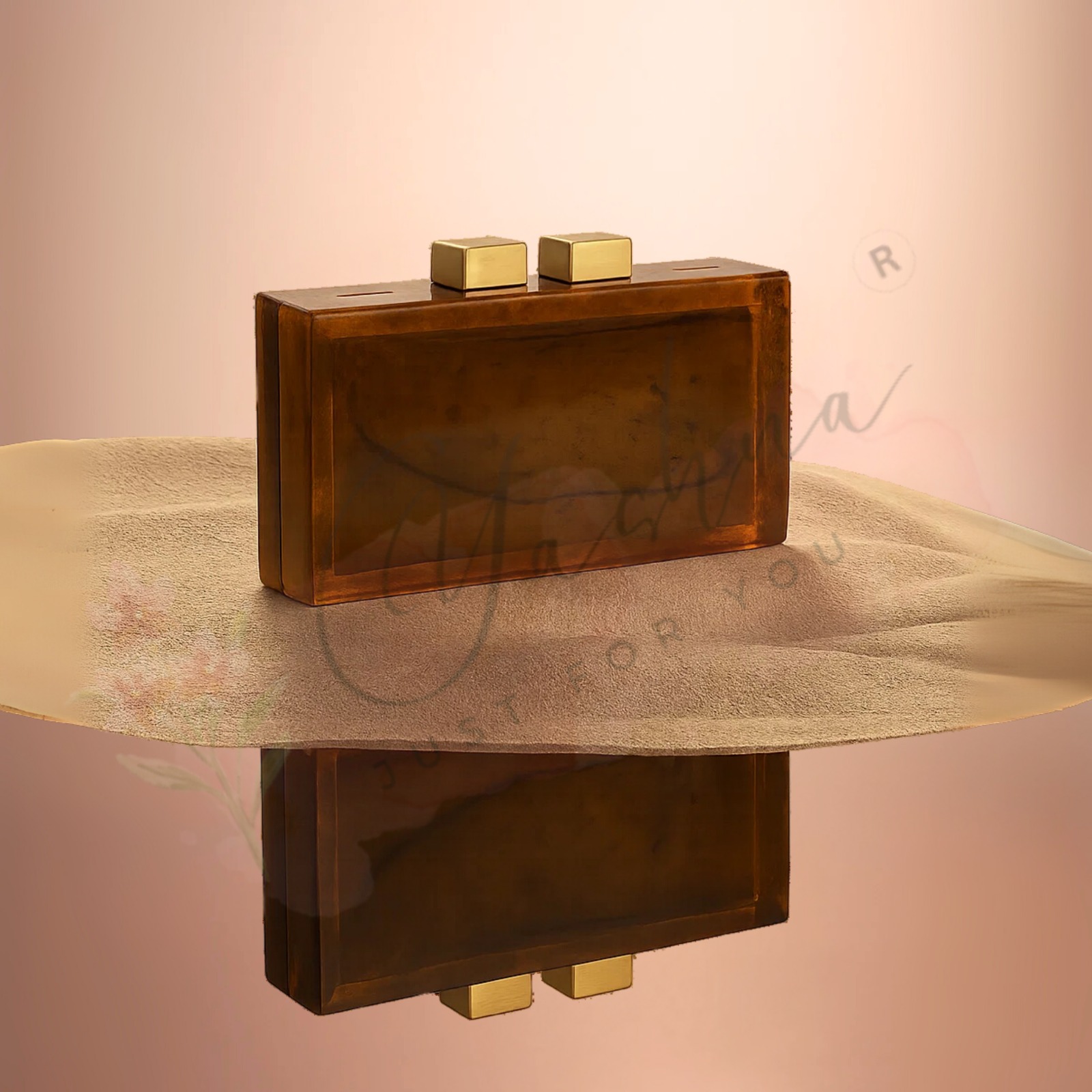 Handcrafted from premium resin in a warm amber tone, this clutch features a sleek rectangular box design accented with dual golden cube clasps for a modern touch. Its glossy finish and structured silhouette make it both elegant and versatile, perfect for carrying essentials at festive celebrations, cocktail evenings, or sophisticated gatherings.