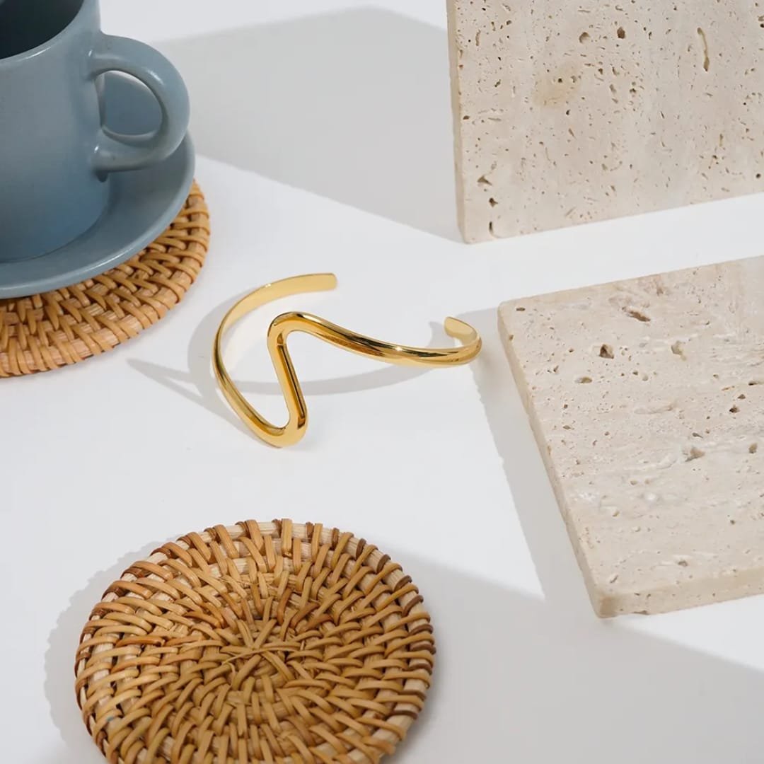 Sculptural and fluid, the Aurelia Wave Cuff features a sleek gold-tone finish shaped into a soft, flowing curve. Its open design adds a modern edge while keeping it lightweight and easy to wear. Perfect for elevating everyday looks or adding a bold yet minimal statement to your outfit.
