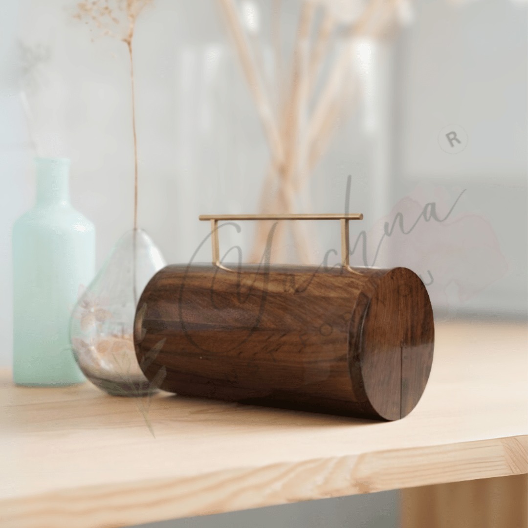 The Barrel Luxe Clutch is a flawless balance of artistry and elegance, handcrafted from rich Sheesham wood with a smooth barrel-shaped silhouette. Its sleek brass handle adds a touch of contemporary sophistication, making it a versatile accessory that seamlessly elevates both traditional and modern ensembles. Perfect for weddings, festive occasions, and evening soirées, this clutch is designed to be a true statement piece.