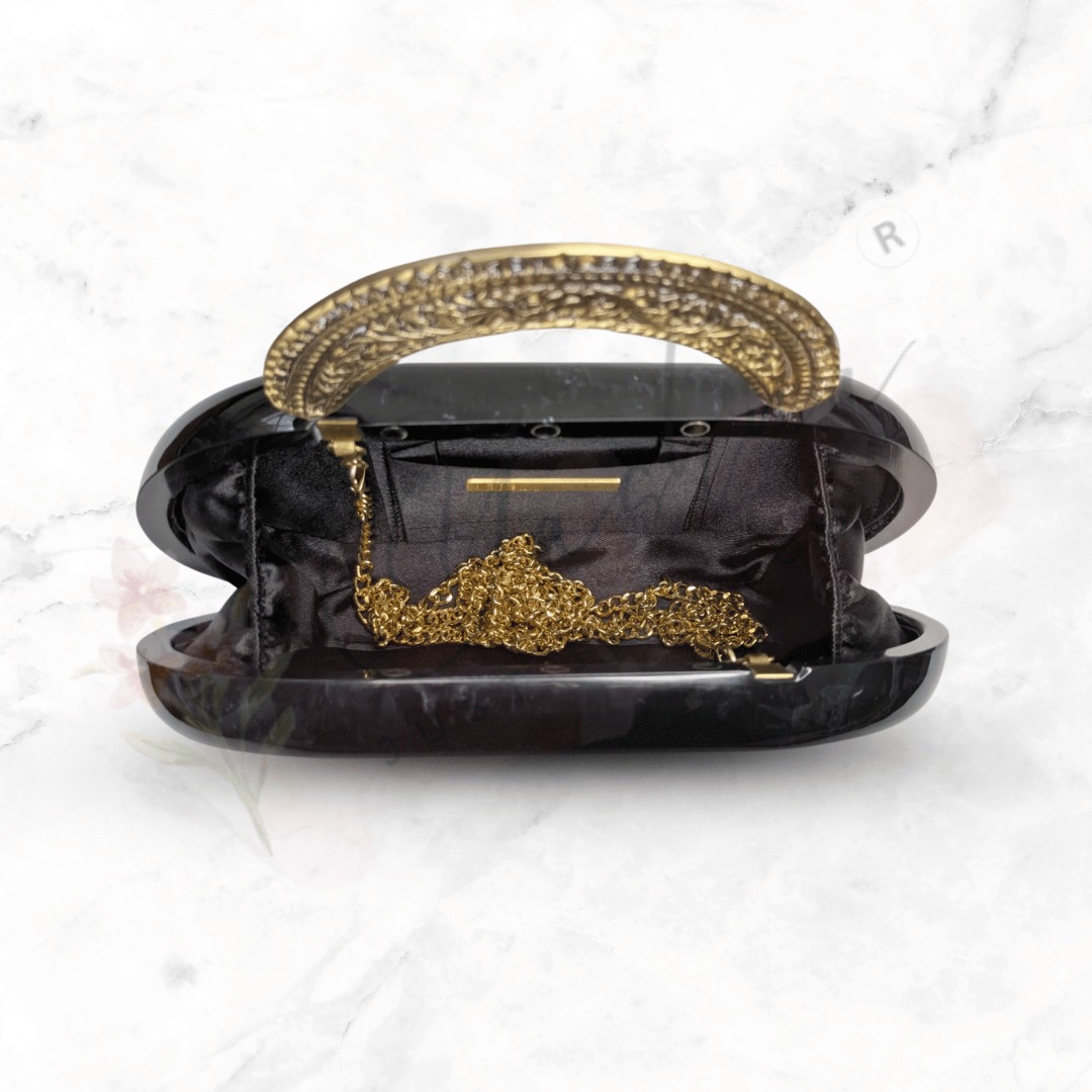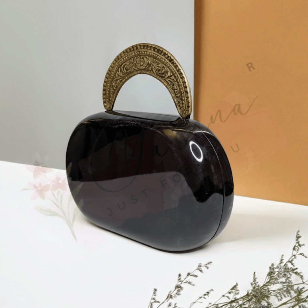 Black Majesty Resin Clutch is a timeless blend of sophistication and artistry. Handcrafted from premium resin in a deep, glossy black finish, it exudes elegance with every glance. The statement brass handle, intricately detailed with traditional motifs, adds a regal charm while offering a comfortable grip. Perfect for evening soirées, festive occasions, or formal gatherings, this clutch is designed to elevate your style with grace and luxury.