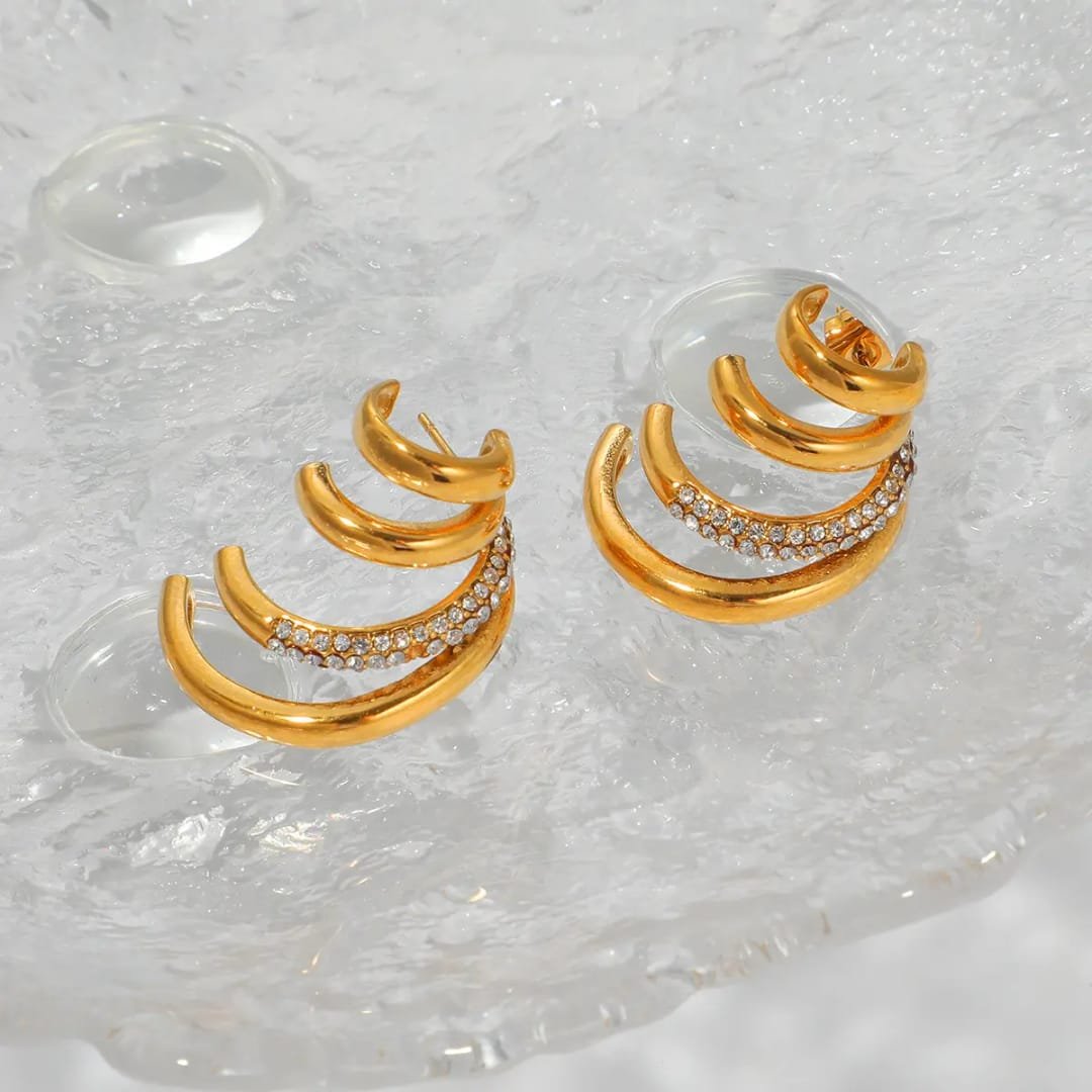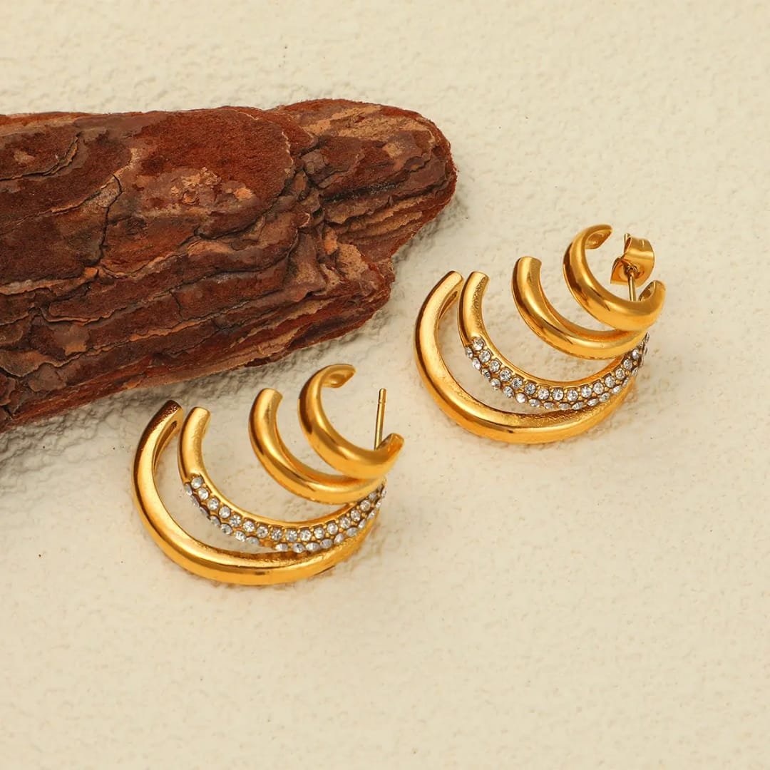 A bold blend of elegance and edge, these triple-layered hoops are designed to make a statement. Featuring a sleek gold finish paired with a delicate row of shimmering stones, they add just the right amount of sparkle. Lightweight yet impactful, they effortlessly elevate both everyday looks and evening styles. Perfect for those who love modern glamour with a touch of sophistication.