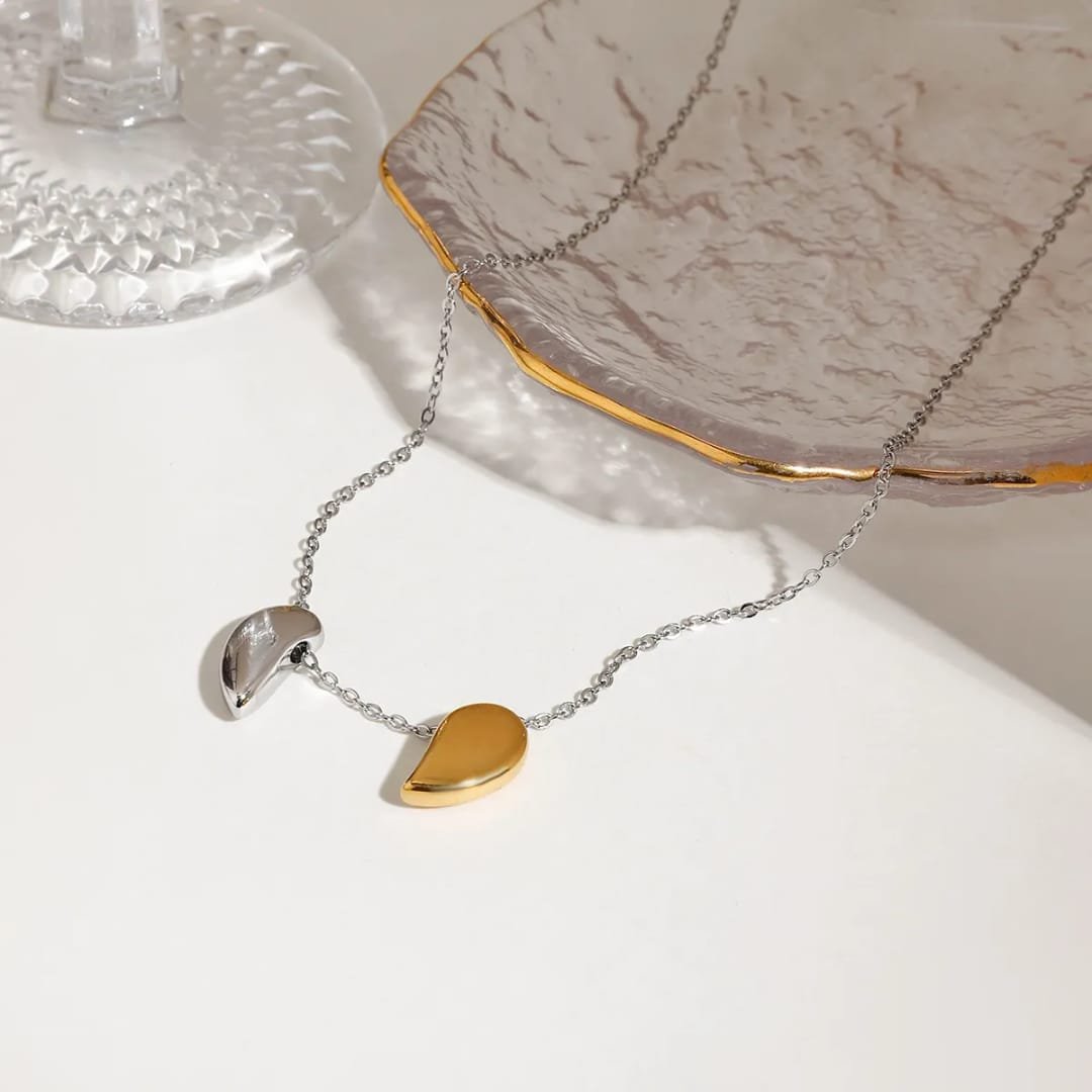 Modern and meaningful, the Dual Tone Heart Pendant Necklace features a split-heart design in contrasting gold and silver finishes. The sleek, polished surfaces create a contemporary yet timeless look, symbolizing balance and connection. Set on a delicate chain, it’s perfect for everyday wear or as a thoughtful gift with a stylish edge.