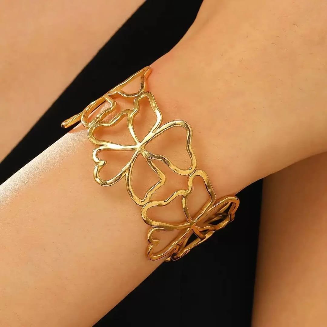 Graceful and artistic, the Floral Blossom Bracelet features abstract blooming flower motifs flowing along an open cuff design. Finished in a radiant gold tone, it blends delicate femininity with a modern, sculptural touch. Lightweight yet eye-catching, it’s perfect for adding an elegant statement to both everyday and occasion looks.