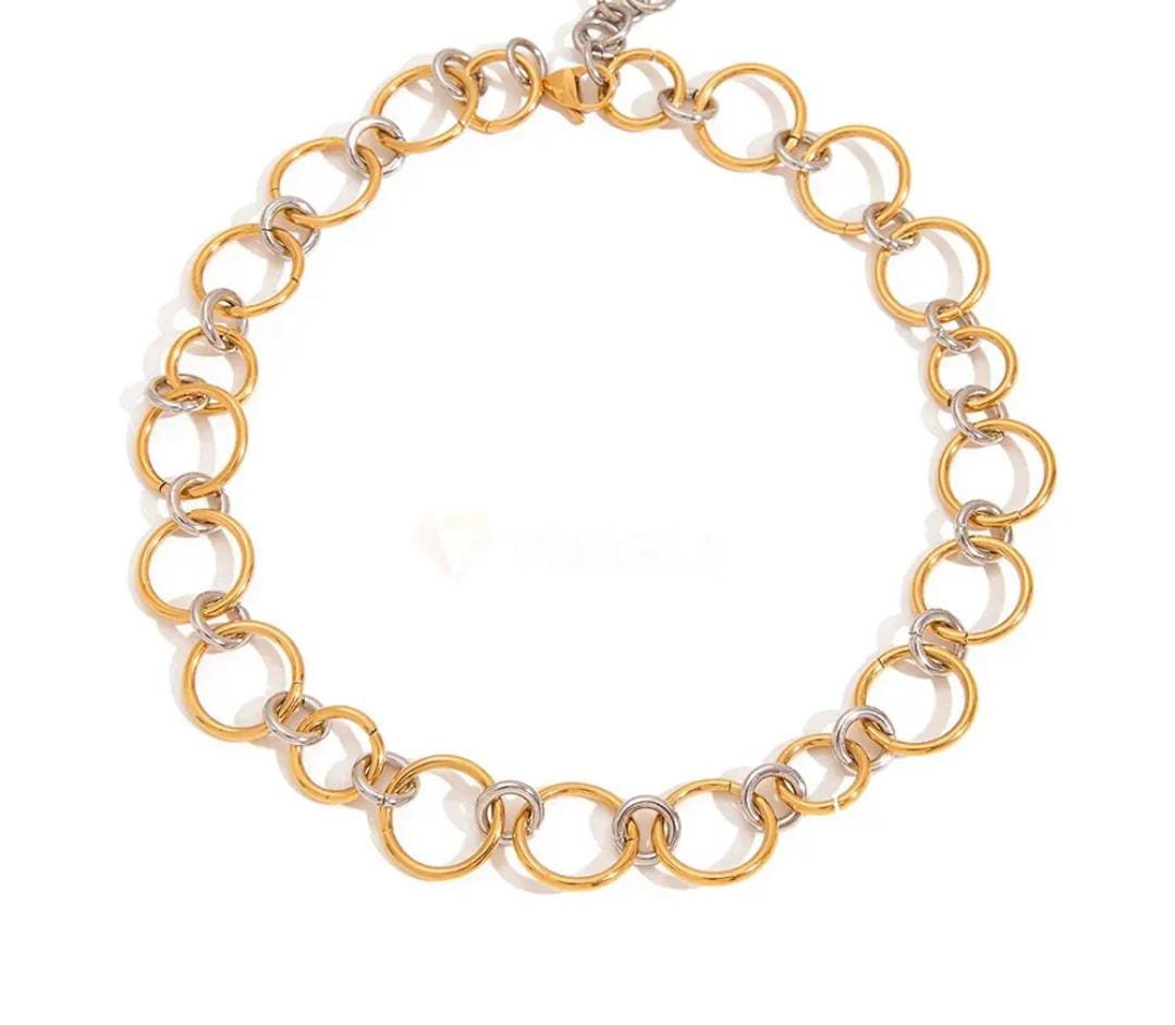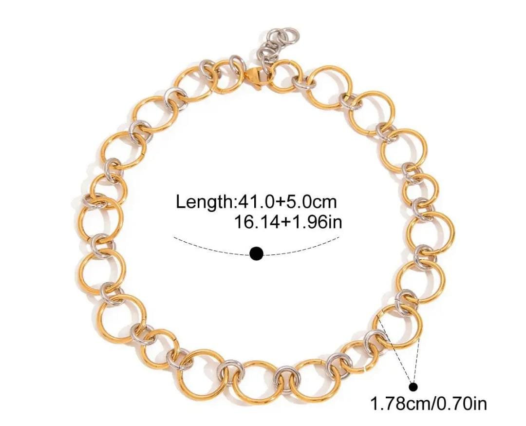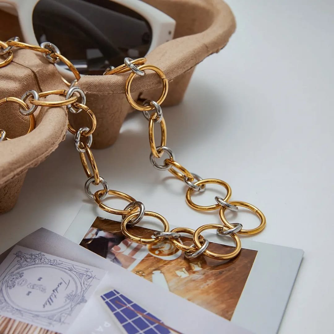 Bold and contemporary, the Fusion Duo Chain Necklace features oversized interlocking links in a striking mix of gold and silver tones. The dual-metal design adds depth and versatility, making it easy to style with any outfit. A true statement piece, it brings modern edge and effortless sophistication to your look.