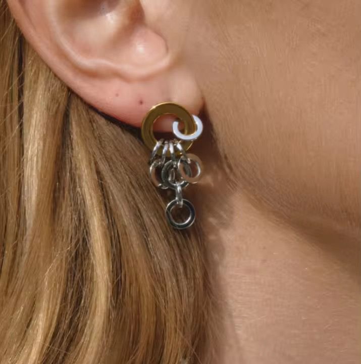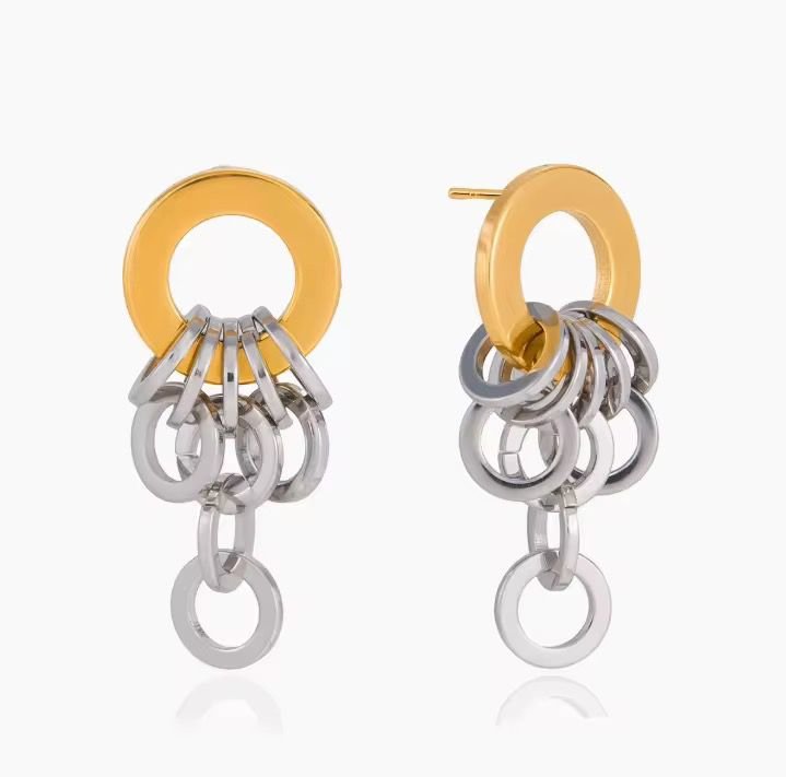 Add a bold edge to your look with these gold and silver link drop statement earrings, featuring a modern dual-tone design with cascading interlinked rings. Crafted for a contemporary aesthetic, these earrings combine a sleek gold top with fluid silver chain drops for dynamic movement and shine. Lightweight yet eye-catching, they are perfect for elevating everyday outfits or making a statement at special occasions. A must-have piece for lovers of modern, versatile jewellery.