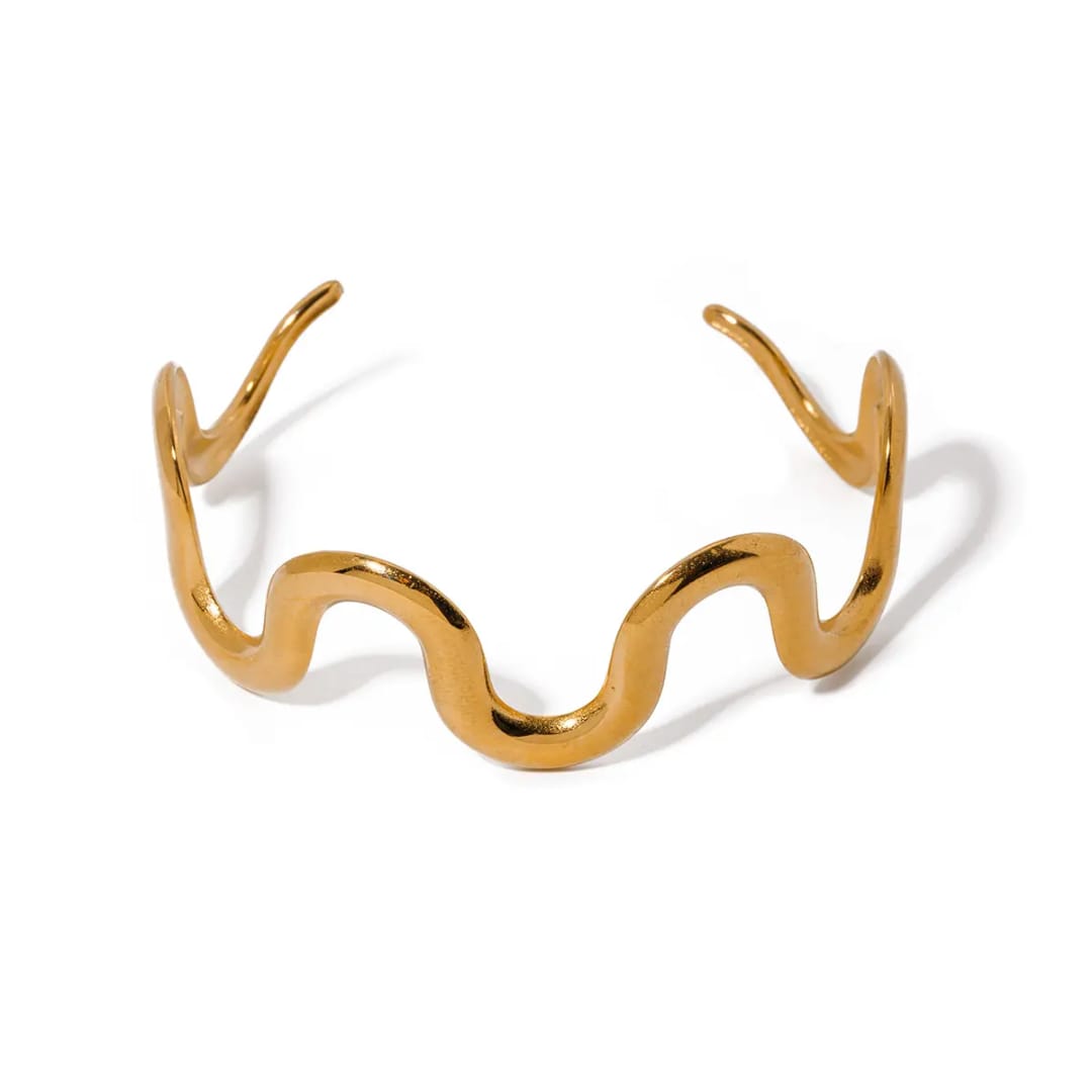 Flowing with rhythm and elegance, the Waveform Cuff is designed with soft, wavy contours in a radiant gold finish. Its fluid silhouette captures the beauty of movement, making it a playful yet sophisticated statement piece that complements both casual and evening looks.