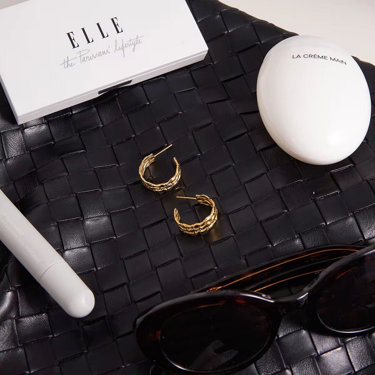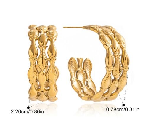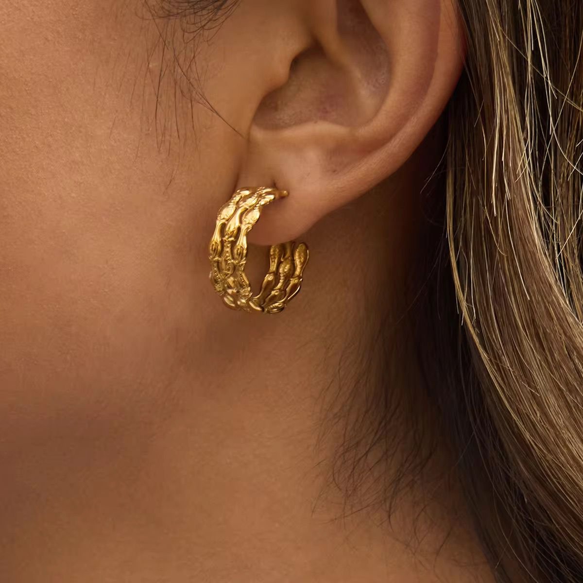 Rich in detail and bold in presence, these hoops feature an intricate, sculpted design that feels both regal and contemporary. The molten-like texture creates depth and dimension, catching light beautifully from every angle. With a structured yet fluid form, they make a powerful statement while remaining wearable. Perfect for elevating evening looks or adding a touch of opulence to everyday styling, these earrings embody modern luxury with a timeless edge.