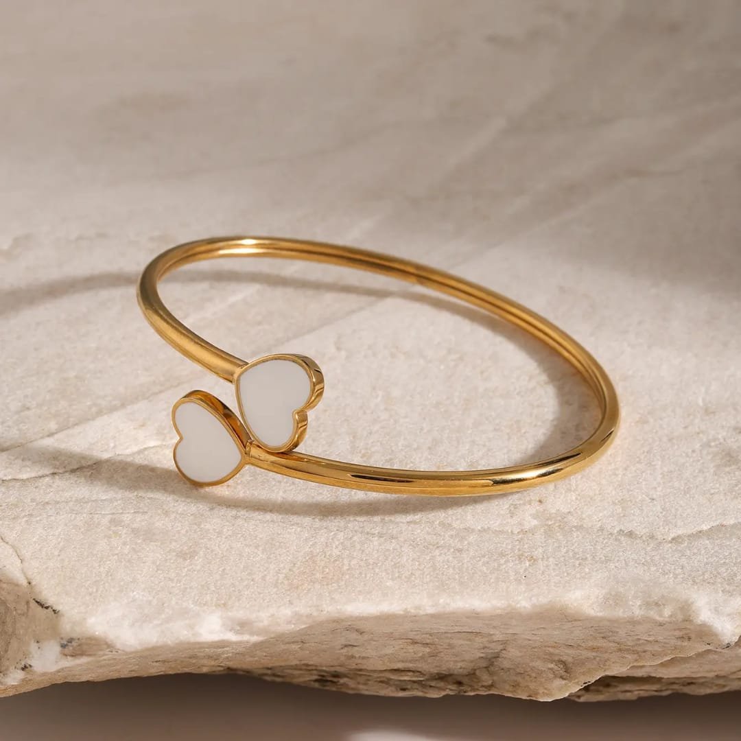 Graceful and refined, the Ivory Twin Heart Cuff features two delicate heart motifs in a soft ivory enamel finish, set against a sleek gold-tone band. Designed with a minimal open silhouette, it adds a subtle romantic charm to your everyday look. Lightweight, timeless, and effortlessly elegant, it’s perfect for stacking or wearing solo as a gentle statement of style.