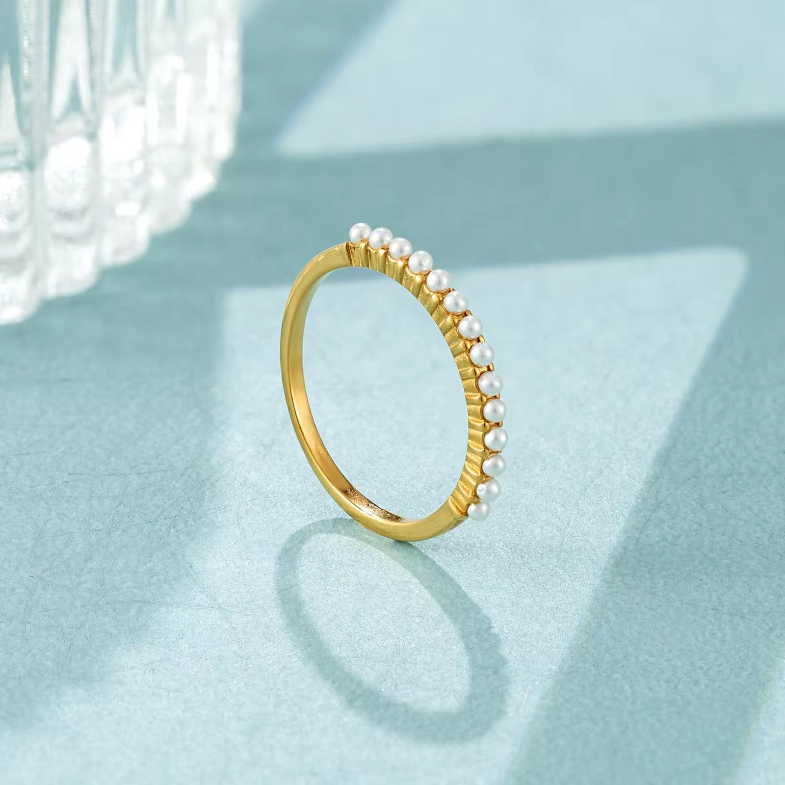 A refined blend of simplicity and grace, this sleek ring features a row of delicate moti perfectly aligned on top for a clean, elegant finish. The minimal design highlights the natural beauty of pearls, making it ideal for both everyday wear and special occasions. Lightweight, timeless, and effortlessly sophisticated—this piece adds a soft touch of luxury to any look.