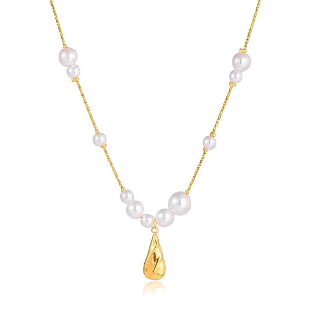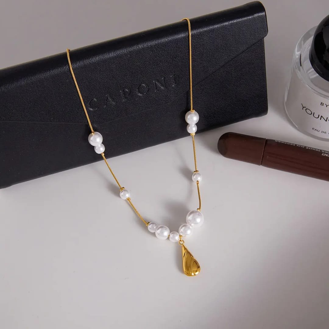 A delicate balance of softness and shine, this necklace brings together lustrous pearls with a fluid, molten-style gold drop. The design feels organic and modern—like gold in motion—while the pearls add a calm, timeless touch. Lightweight and easy to style, it transitions effortlessly from everyday minimal looks to elevated occasions. A piece that feels subtle at first glance, yet striking in detail.