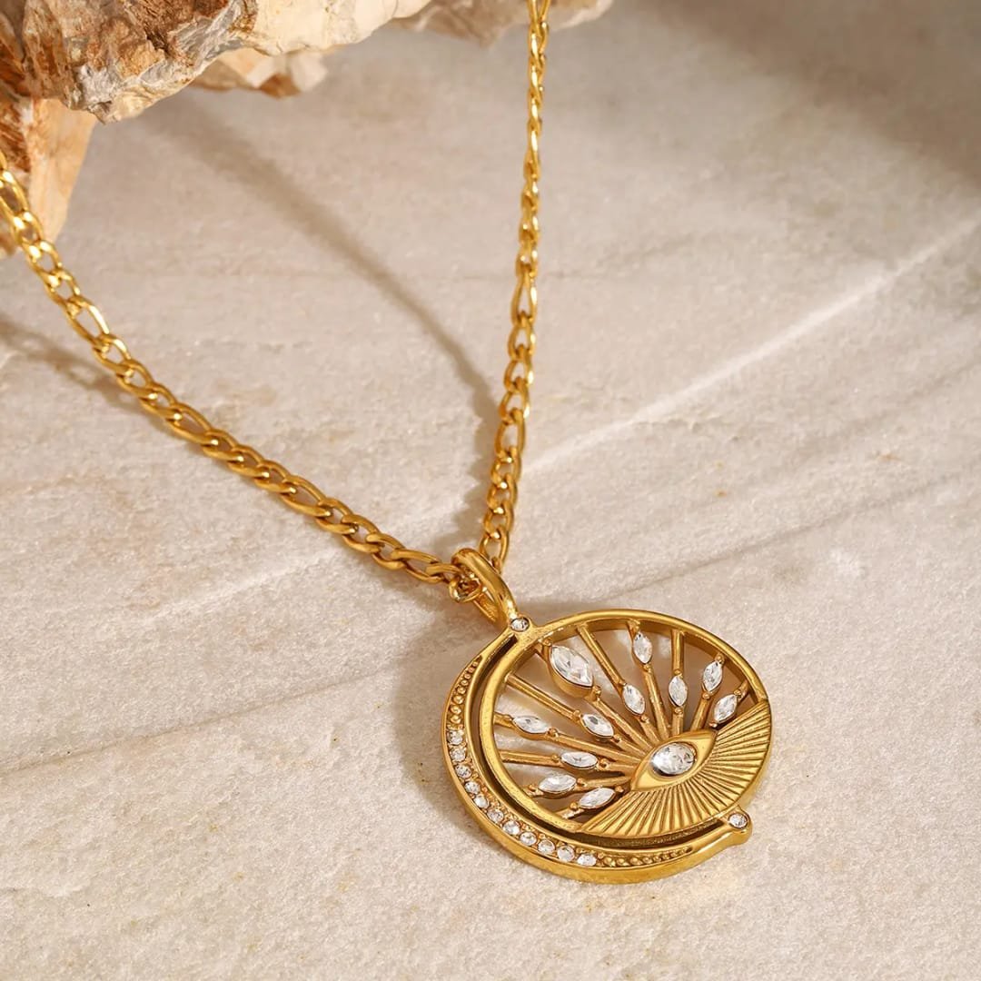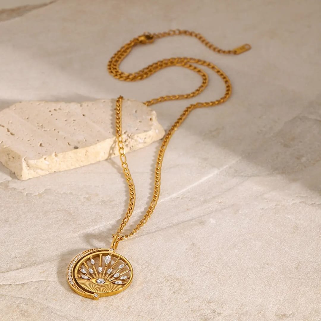 Striking and symbolic, the Radiant Eye Halo Necklace features a captivating eye motif at its center, surrounded by sunburst rays and delicate crystal accents. Crafted in a rich gold-tone finish, it blends protection with luminous elegance. Set on a bold chain, this statement piece adds a touch of mystique and modern glamour to any look.