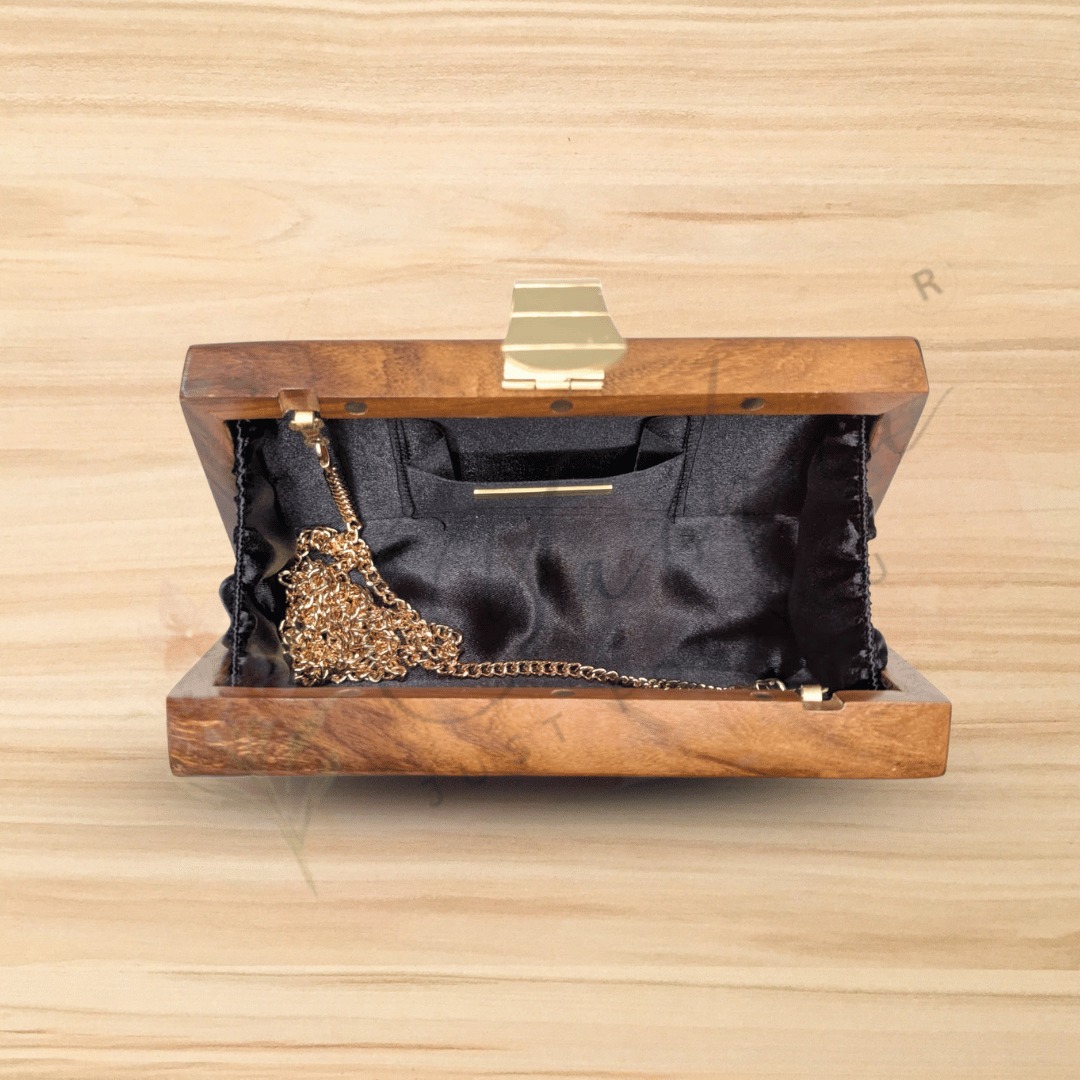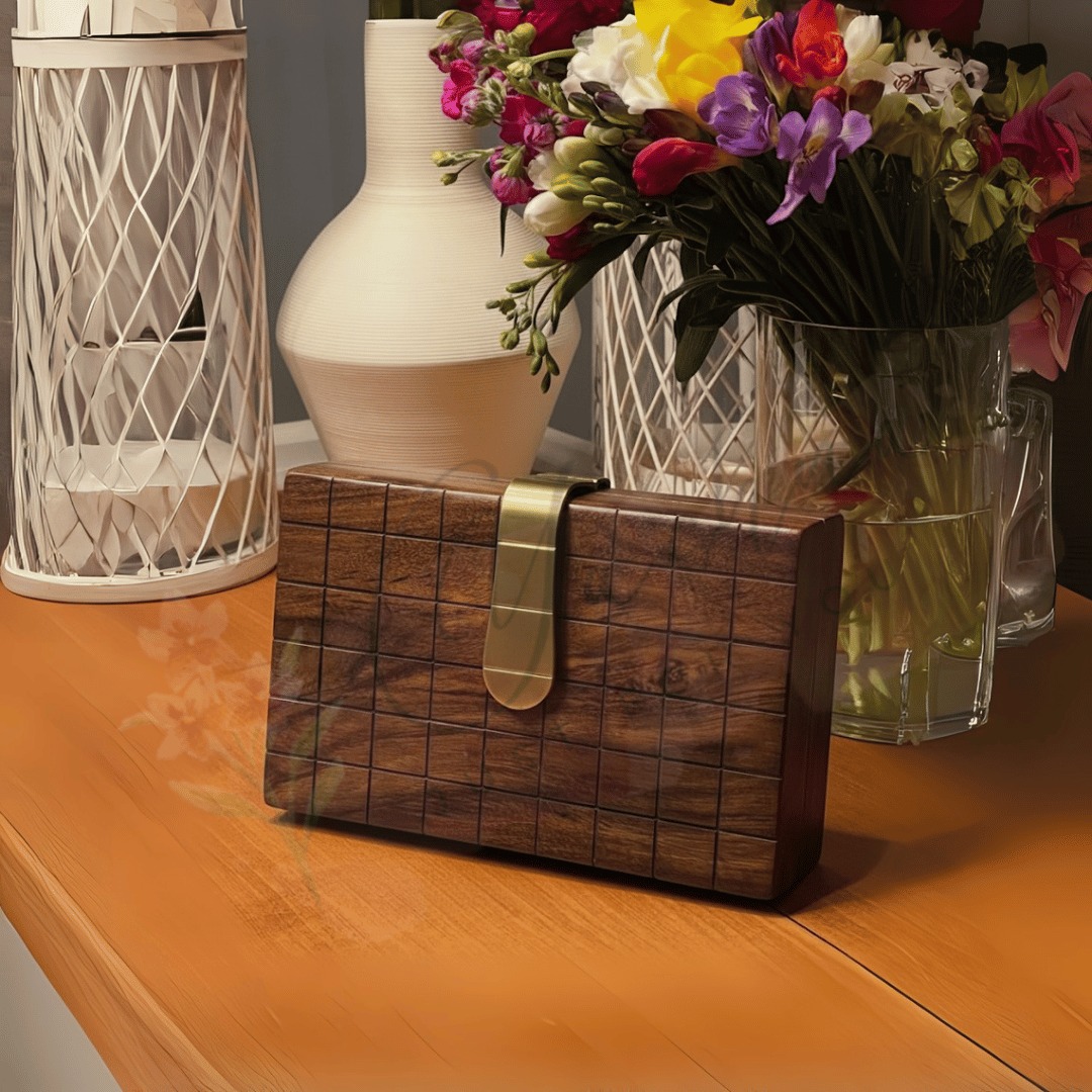 Handcrafted from premium Sheesham wood, the Royal Grid showcases a refined grid-pattern engraving, complemented by polished brass detailing and a secure clasp. Compact yet functional at 7.5 × 4.5 inches, it’s perfectly sized to carry your phone and essentials. With its detachable gold-tone chain, this clutch easily transforms into a sling, offering both style and versatility. Sustainable, durable, and timeless, it’s an ideal companion for weddings, parties, and festive occasions.
