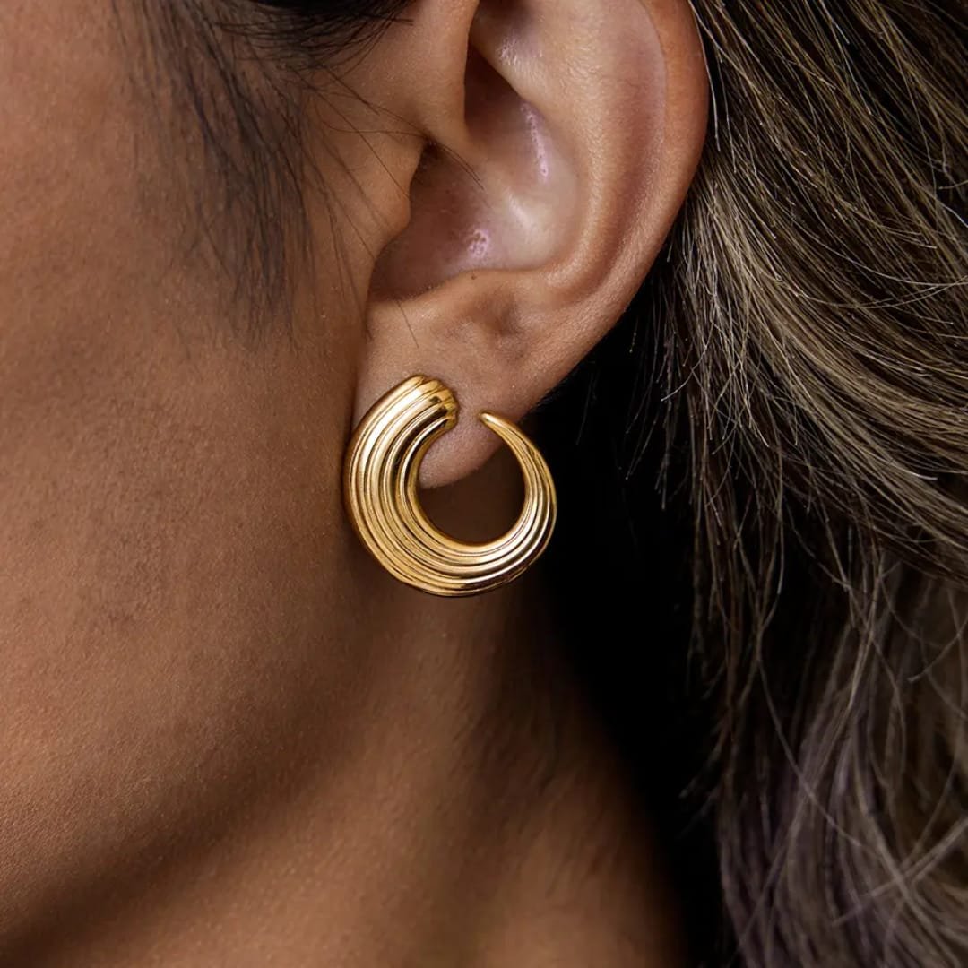 Sleek and contemporary, the Sculpted Curve Hoop Earrings feature layered, fluid lines that create a bold yet refined silhouette. Finished in a rich gold tone, their smooth, curved form adds depth and dimension with a modern edge. Lightweight and versatile, they’re perfect for elevating everyday looks with effortless sophistication.