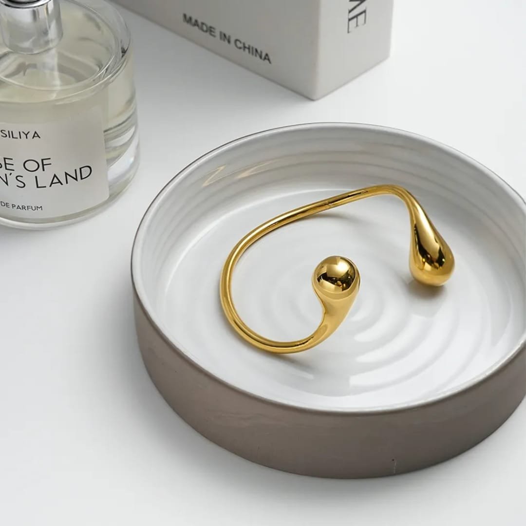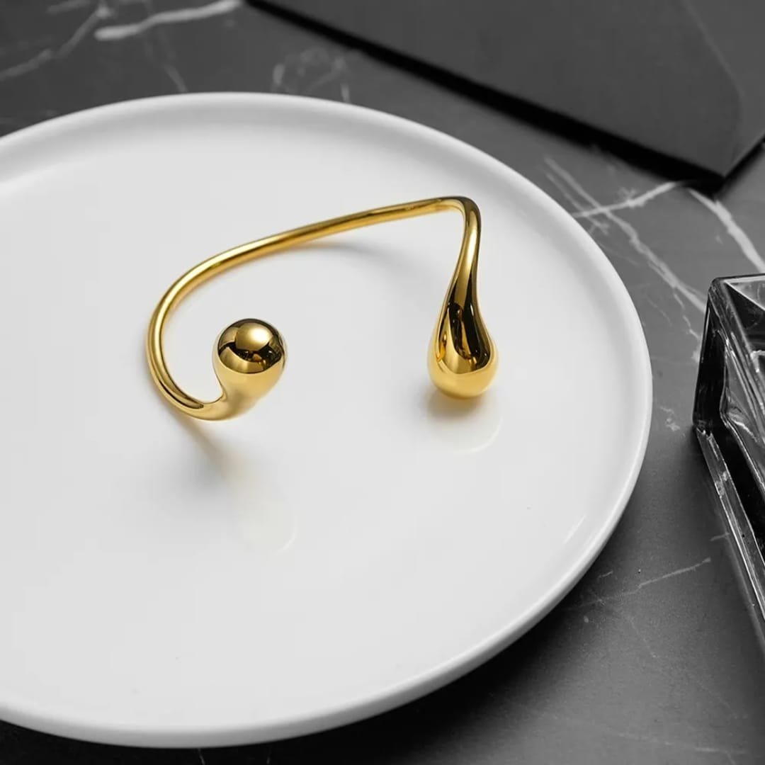 Minimal yet striking, the Sculpted Drop Bracelet features a fluid open cuff design finished with smooth, droplet-inspired ends. Its high-polish gold tone creates a sleek, sculptural look that feels both contemporary and timeless. Lightweight and versatile, it’s the perfect statement piece for effortless, everyday elegance.