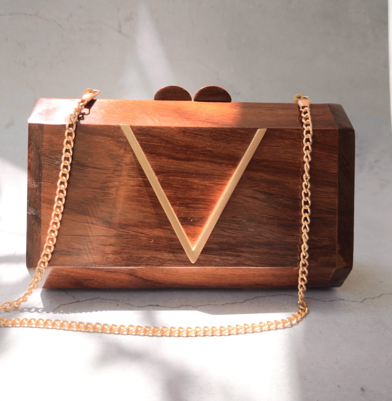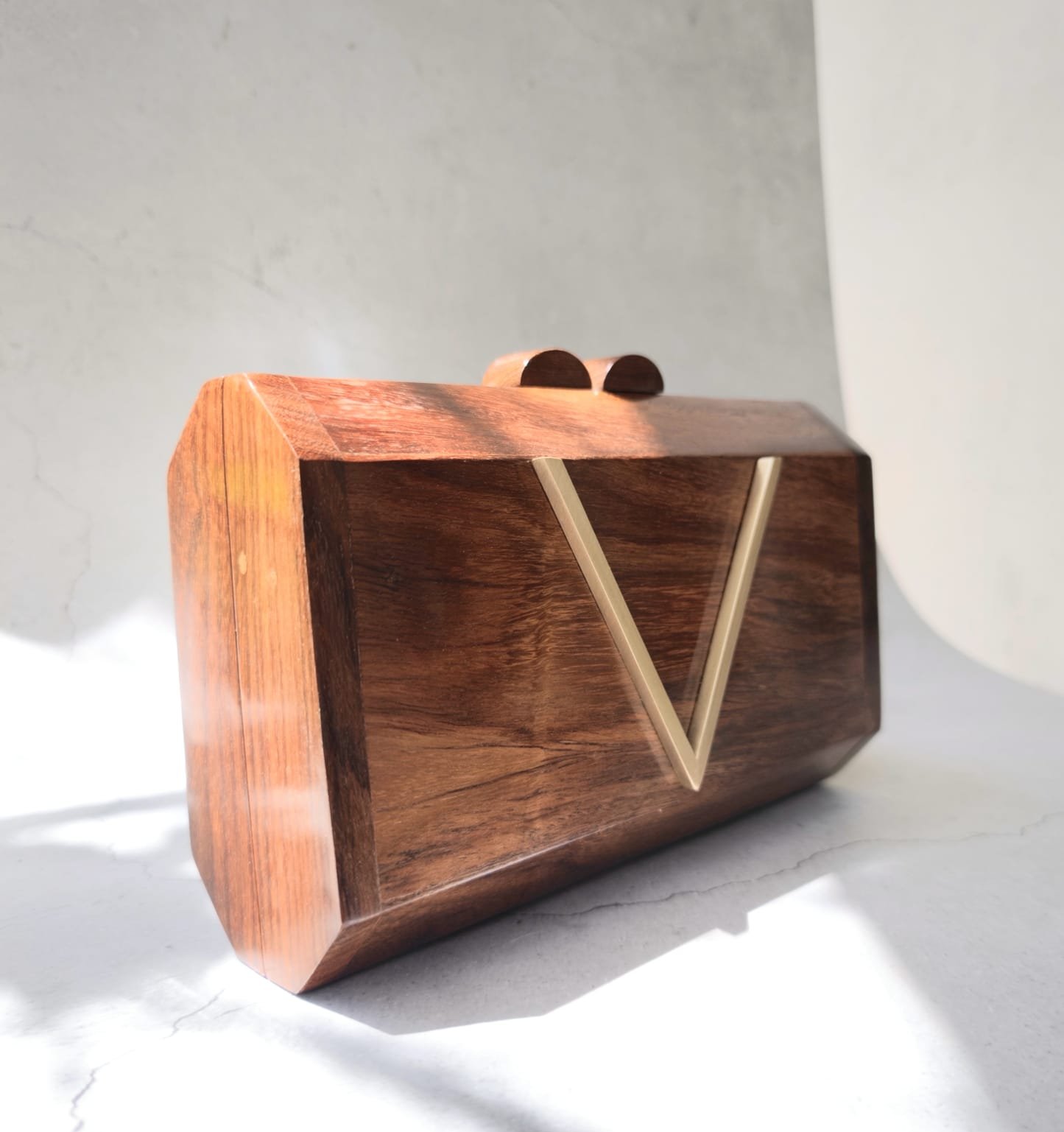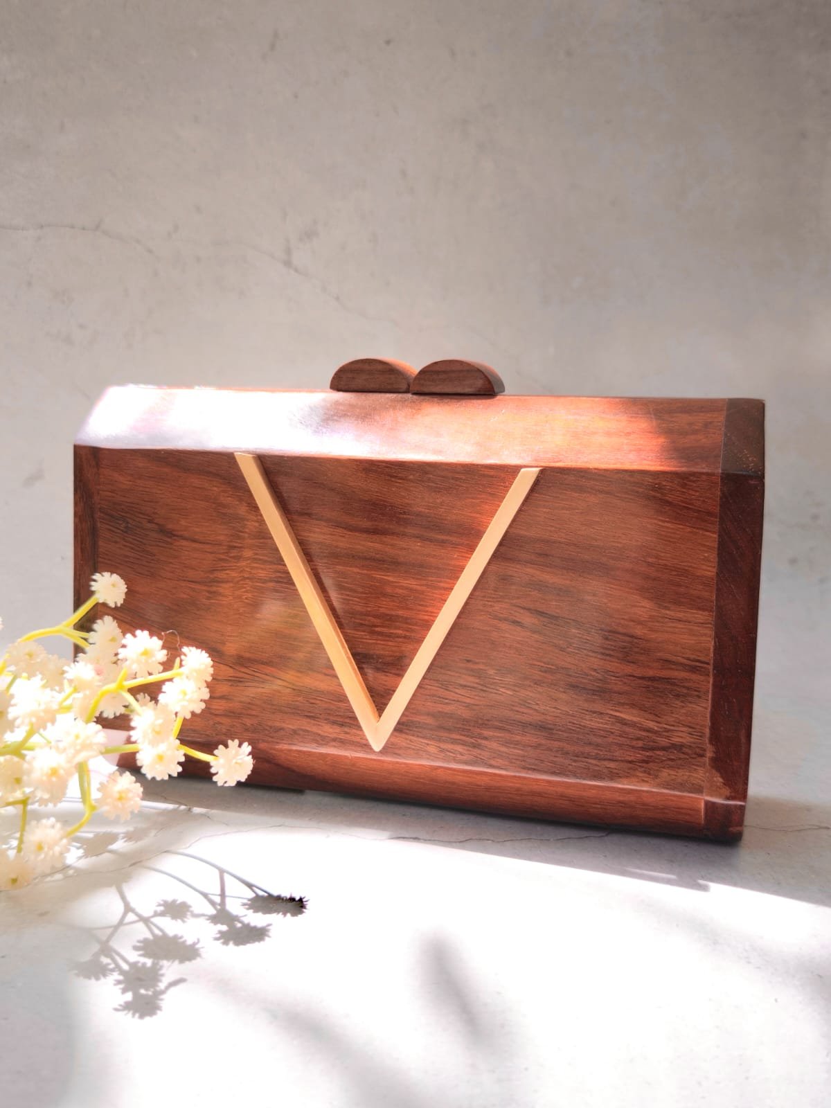 Make a bold statement with our V Monogram Wooden Clutch. Handcrafted from premium wood, this luxury box clutch is perfect for weddings, parties & festive occasions. Shop now for timeless elegance.
